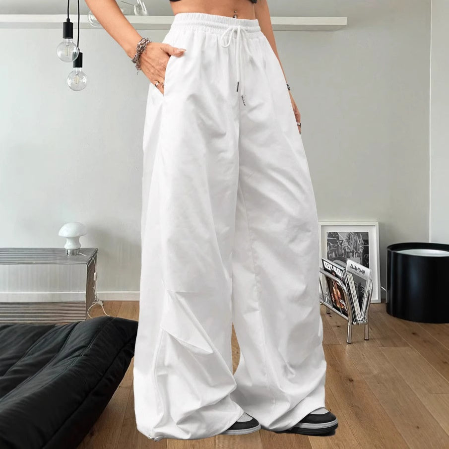 Drawstring Design Wide-Leg Sports Pants Women's Spring Straight Loose High-Waist Slim White Casual Pants